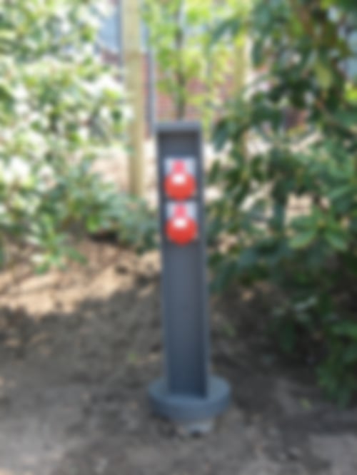 Eine von sechs Außenenergiesäulen, die von der Gebäudeleittechnik ein- und ausgeschaltet werden können. Leitungsverlegung mit Kabelbühnen in den Versorgungsgängen für die gesamte Außenanlage.